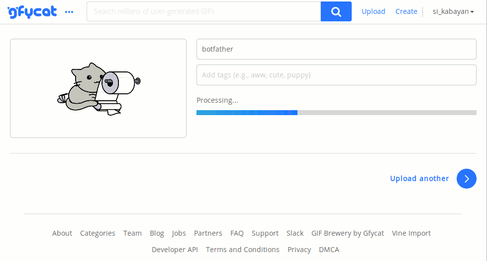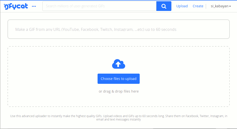 - Silakan meluncur ke gfycat.com untuk mengunggah video. Kita bisa menggunggah secara anon, alias tanpa mendaftar terlebih dahulu. Namun jika akan sering menggunggah ke Gfycat, disarankan untuk mendaftar akun saja. Agar kita bisa menata berkas-berkas yang kita unggah.