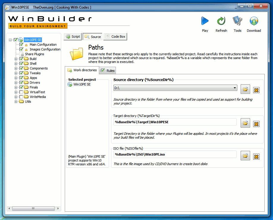 BuilderSE.exe. Jangan kaget jika kemudian jendela yang muncul ternyata berjudul Win Builder. Karena Win10PE memang berdasarkan Win Builder.- Klik menu Win10PE SE dalam panel kiri, kemudian klik tab Source dalam panel kanan. Di bagian panel kanan klik tab Work directories, dan kita akan menemukan tiga buah kolom untuk menentukan letak berkas installer Windows (source directory), direktori target dan tempat berkas ISO hasil build akan disimpan. Jika bingung, cukup tentukan kolom Source directory saja.
