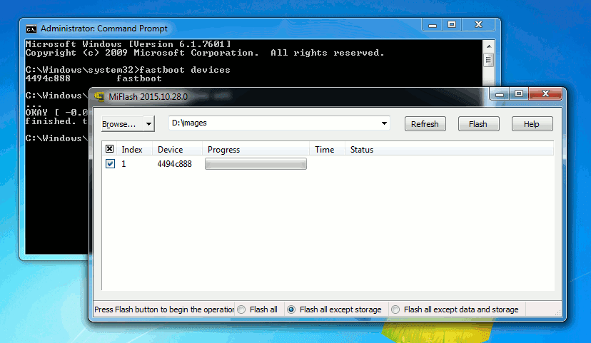 ADB, kita bisa menggunakan MiFlash untuk mengetahui apakah hape juga telah dikenali oleh MiFlash. Lihat di kolom Device pada MiFlash, isinya mesti sesuai dengan hasiladb devices, yang dalam contoh ini adalah4494c888. Jika MiFlash tidak langsung mengenali hape, coba klik tombol Refresh.Tahan tombol POWER dan VOLUME DOWN pada hape untuk membuatnya masuk fastboot.